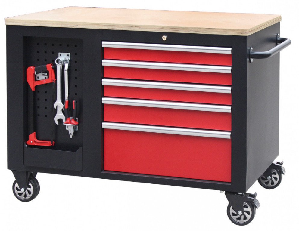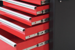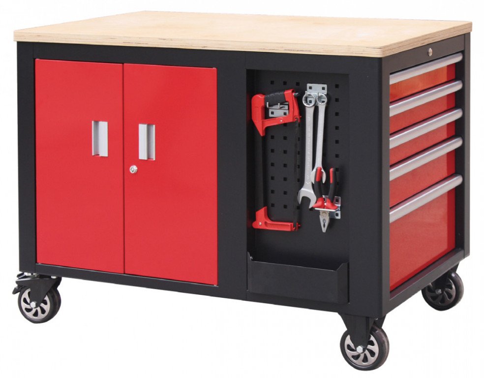 Černo-červený velký dílenský vozík s 10-ti zásuvkami o rozměrech (š x h x v): 1141 x 730 x 888 mm. Vozík je zamykatelný, má 2 pevná a 2 otočná pogumovaná kolečka a je doslova všestranný. Uskladňovací prostory má ze všech stran!