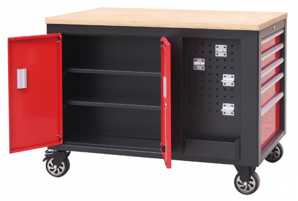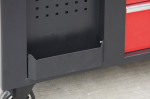 Na širších stranách vozíků jsou 2x děrované desky s přihrádkou, z jedné strany 5 zásuvek a z druhé dvoukřídlá skříňka se 2-mi poličkami. Na užších stranách se nachází dalších 5 zásuvek a madlo pro snadné manipulování s dílenských vozíkem.