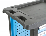Dílenský vozík je celokovový a hrany má opláštěny tvrzeným plastem pro zamezení poškození.