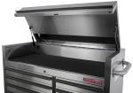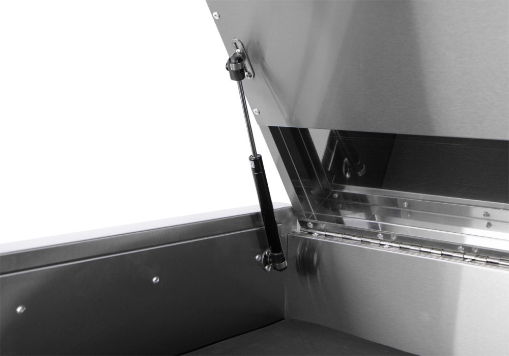 Víko horní části vozíku je vybaveno plynovými vzpěrami, takže se snadno otevírá, a plocha pod ním může sloužit jako odkládací nebo pracovní prostor.