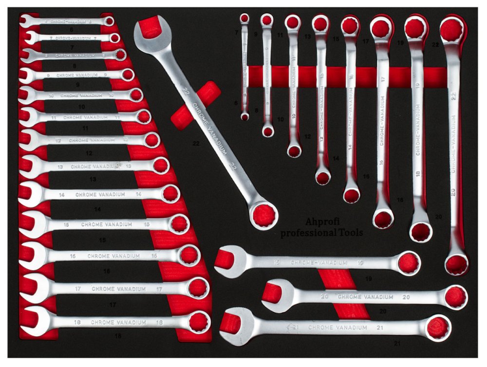 | 8 ks | Očkové klíče: 6 x 7, 8 x 9, 10 x 11, 12 x 13, 14 x 15, 16 x 17, 18 x 19, 20 x 22 mm |