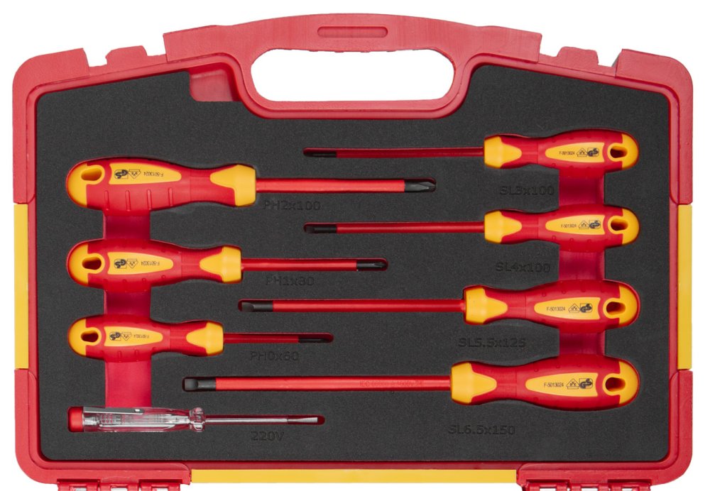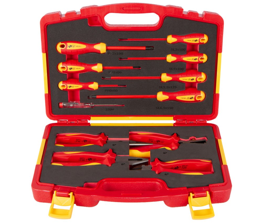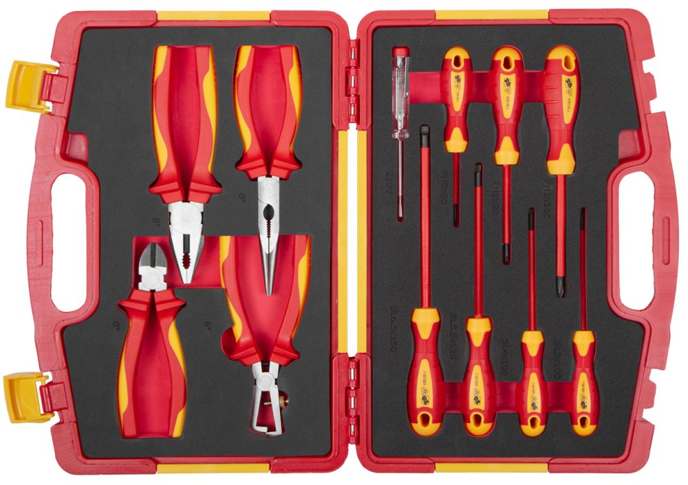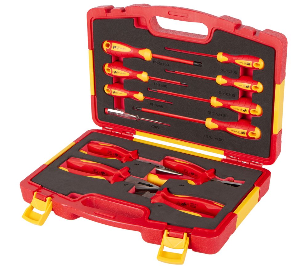 Sada VDE izolovaného nářadí obsahuje 12 kusů profesionálního nářadí, které splňuje přísné normy VDE a GS.