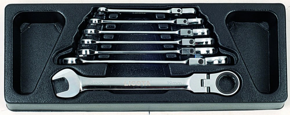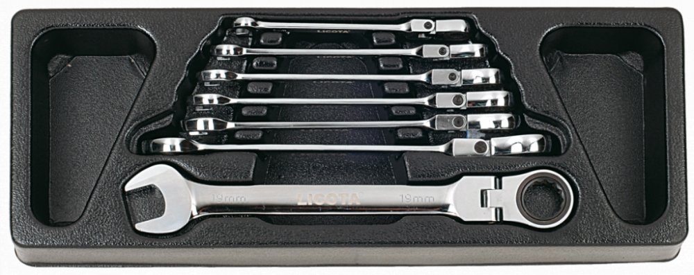 Sada ráčnových klíčů s kloubem LICOTA v plastové výplni vozíků, 7 kusů, CrV ocel, velikost 8 - 19 mm.