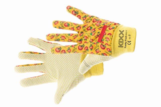 FUNKY FRUIT rukavice bavlněná s PVC terčíky oranžová 8 Bavlněné rukavice s PVC body pro lepší uchopení. S manžetou. Absorbují vlhkost. Ideální pro činnosti, jako je přesazování rostlin. EN 420