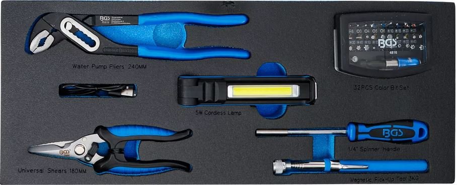 Sada obsahuje širokou škálu ručního nářadí včetně izolovaných nástrojů testovaných dle normy DIN EN/IEC 60900. Vše je uloženo v pevném kovovém kufru se 3 zásuvkami a horní přihrádkou s víkem.