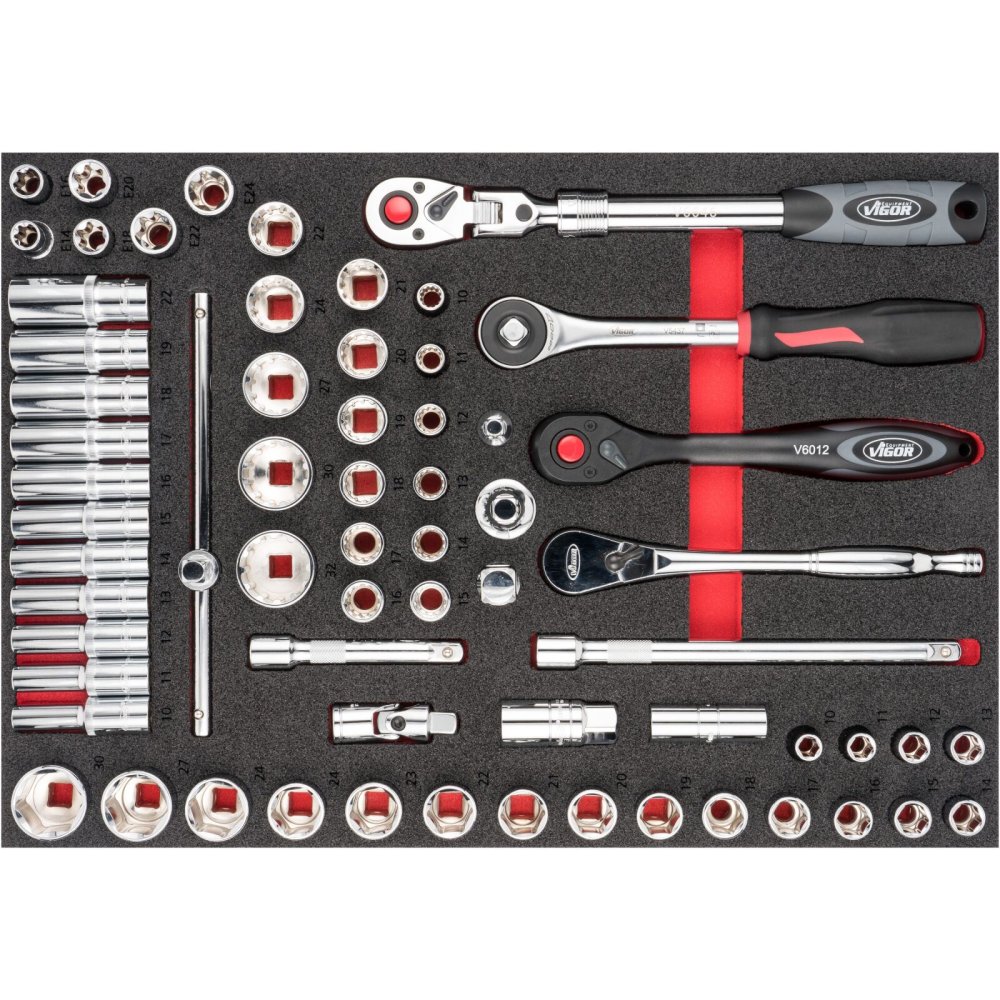 Pěnová vložka o rozměrech (š x h x v) 563 x 393 x 35 mm obsahuje celkem 65 ks profesionálních nástrčných klíčů a gola sady 1/2".