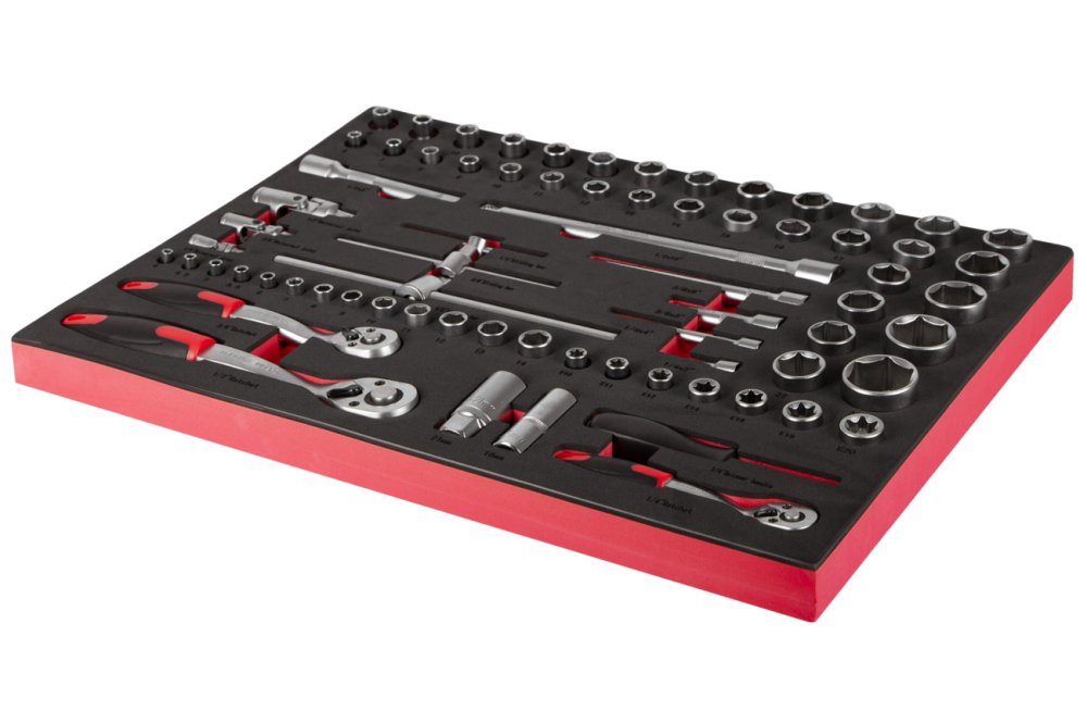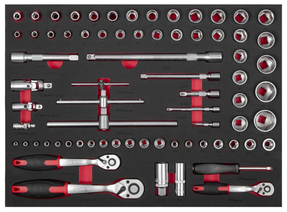 Gola sada o velikosti 1/4", 3/8" a 1/2". Sada 72 ks nářadí do dílenského vozíku je přehledně uložena v pěnové výplni .