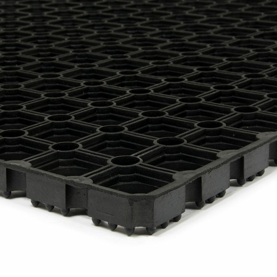 Díky své konstrukci umožňuje prorůstání trávy a přirozený odvod vody, což zajišťuje stabilní a bezpečný povrch. Rohož je vyrobena z odolné gumy, která se vyznačuje vysokou životností, odolností vůči opotřebení a bezpečností při používání.