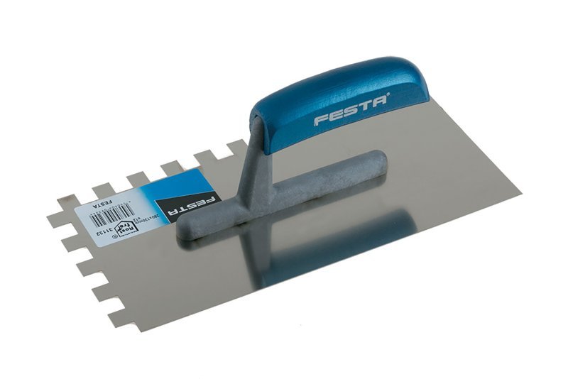 Hladítko nerezové zubové FESTA 280x130 mm, zub e12, s dřevěnou ručkou, tl.plechu 0,8mm. Používá se zejména k nanášení lepidel pod obklady a dlažby, dále pak k nanášení stěrek, štuků, omítek, tmelů a dalších stavebních hmot. Hladítko nerezové zubové umožní natáhnout lepidlo či stavební hmotu v pruzích a výšce dle zubu hladítka.