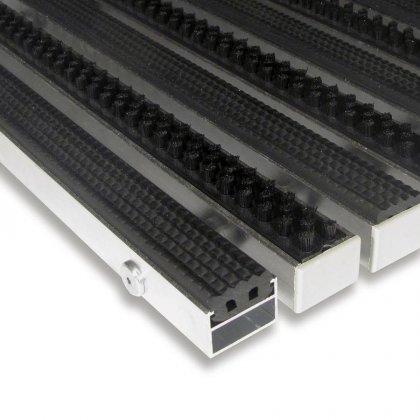 Základem rohože Alu Extra jsou hliníkové profily o šířce 27 mm, které jsou spojeny nerezovým lankem a odděleny pryžovými mezikroužky, tím je umožněno stáčení rohože a jednodušší manipulaci při úklidu. Do hliníkových profilů se fixují gumové nebo textilní pásky, které lze libovolně kombinovat a po opotřebení vyměnit. Mezi hliníkové profily je navíc možné vložit hliníkovou škrabku. Nejčastější po... Celý popis