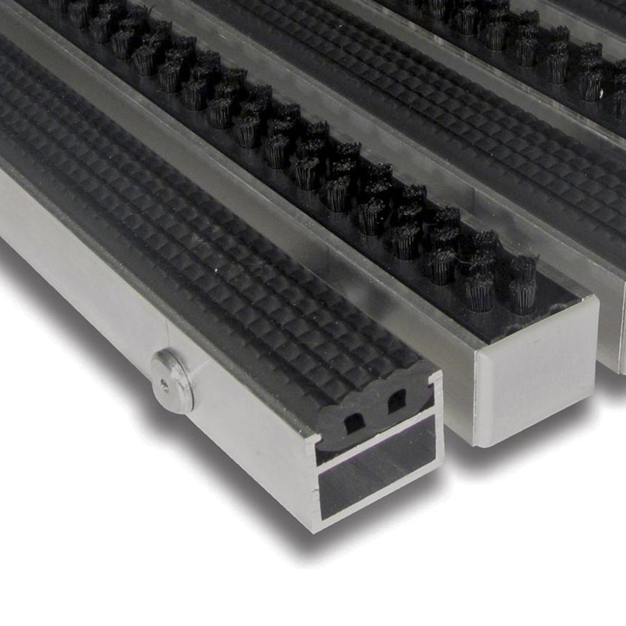 Základem rohože Alu Extra jsou hliníkové profily o šířce 27 mm, které jsou spojeny nerezovým lankem a odděleny pryžovými mezikroužky, tím je umožněno stáčení rohože a jednodušší manipulaci při úklidu.