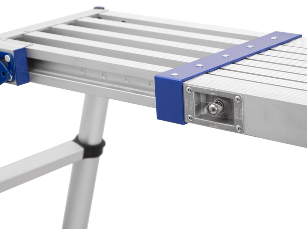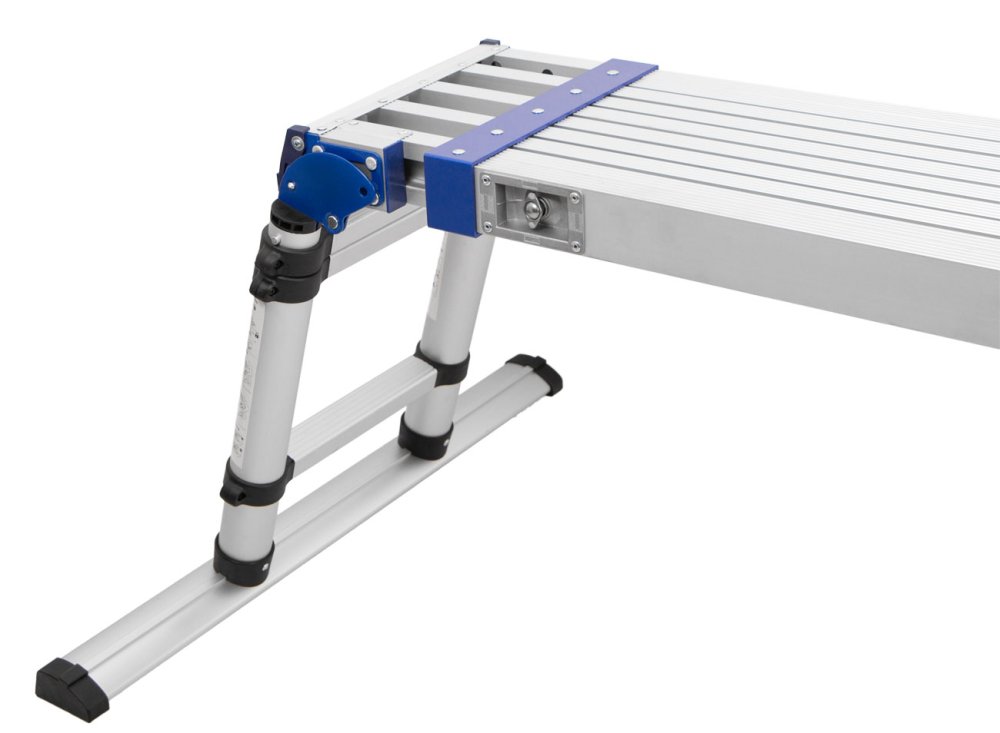 Plošina je opatřena extra širokými příčnými traverzami, které přispívají k vysoké stabilitě na různých površích, a systémem pro rychlé nastavení délky i výšky.