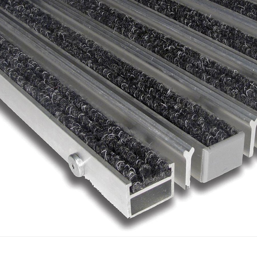 Základem rohože Alu Extra jsou hliníkové profily o šířce 27 mm, které jsou spojeny nerezovým lankem a odděleny pryžovými mezikroužky, tím je umožněno stáčení rohože a jednodušší manipulaci při úklidu.