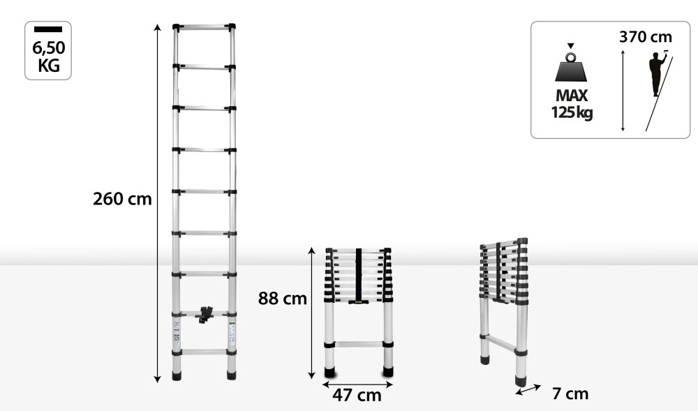 Žebřík je vyroben z odolného hliníku, který zajišťuje dlouhou životnost, lehkost a nosnost až 125 kg.
