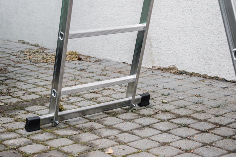 Stabilizační lišta o délce 675 mm s protiskluzovými zakončeními zajišťuje, že se žebřík nehýbe ani na nerovném povrchu.