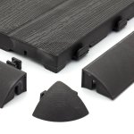 Nájezd na zámkovou terasovou dlaždici Linea Easy s dřevěným dezénem vyrobený z polypropylenu, jež je obohacen o uhličitan vápenatý k dosažení správné tuhosti nájezdu.