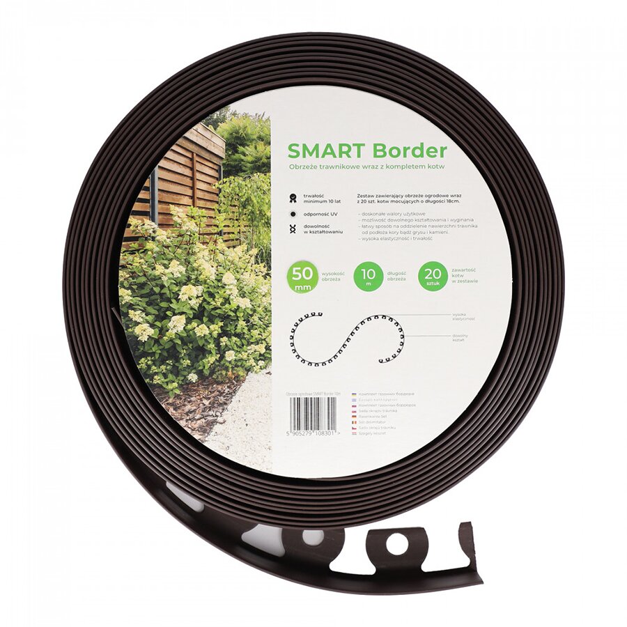 Plastový zahradní obrubník v roli 10 m se sadou 20 kotev o délce 18cm. Flexibilní lemování z vysoce kvalitního materiálu umožňuje vytvářet oblouky, kruhy, nebo jakýkoli jiný tvar.