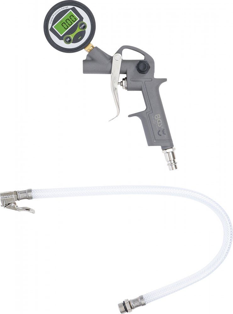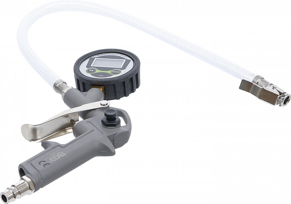 Hustič pneumatik s digitálním manometrem s rozsahem 0 - 8 bar.