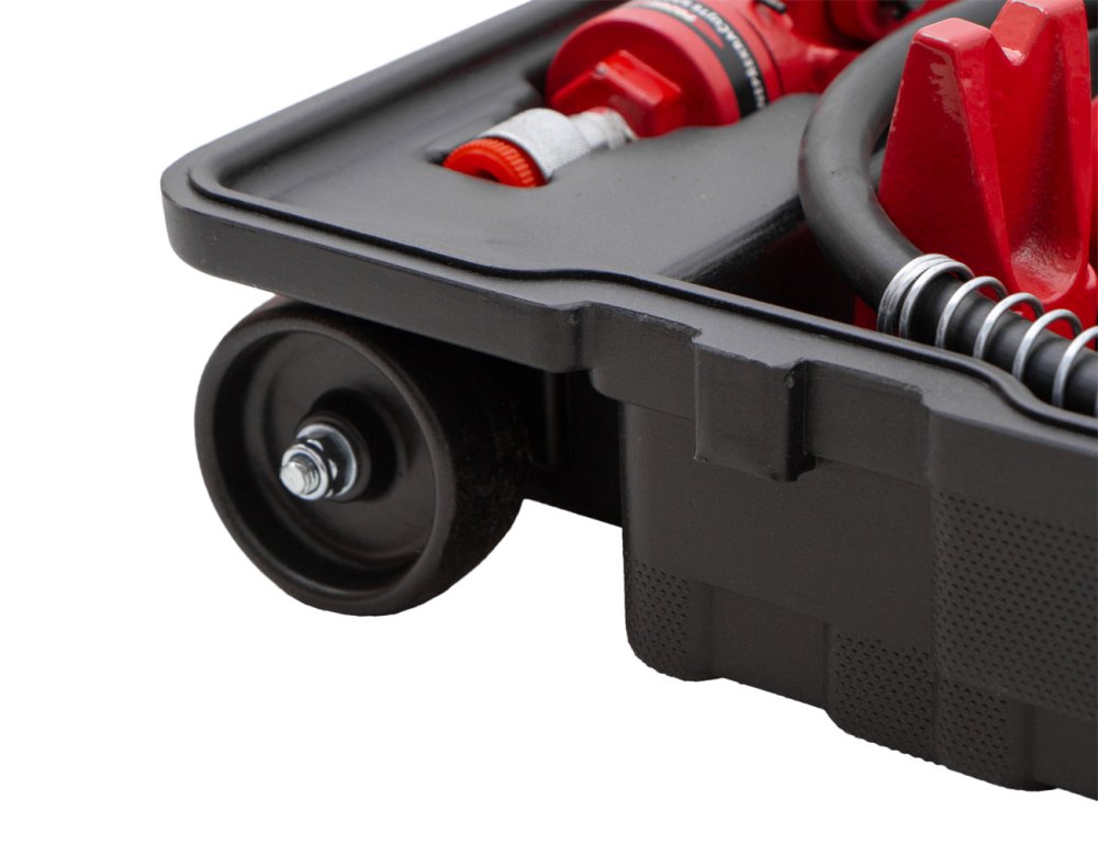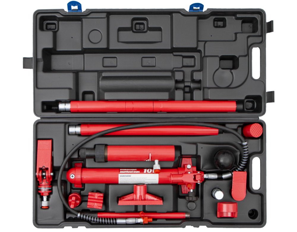 Součástí je hydraulická pumpa, adaptéry a hadice uložené v pevném plastovém kufru, který zajišťuje snadné přenášení a skladování.