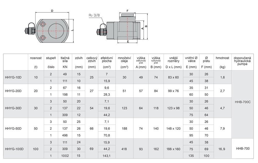 nosnost tlačná síla počet stupňů zdvih celkový zdvih výška se zasunutým pístem (A) výška ve vysunutém stavu (B) efektivní plocha válce maximální pracovní tlak objem oleje vnější průměr (D x L) vnitřní průměr (E) průměr pístu (F) hmotnost doporučená hydraulická pumpa | 100 t 111 / 309 / 1002 kN 3 / 2 / 1 24 / 30 / 15 mm 69 mm 93 mm 162 mm 15,9 / 44,2 / 143,1 cm² 700 bar 418 cm³ 188 x 160 mm 45 / 75 / 135 mm 38 / 69 / 100 mm 16,9 kg HHB-700 |