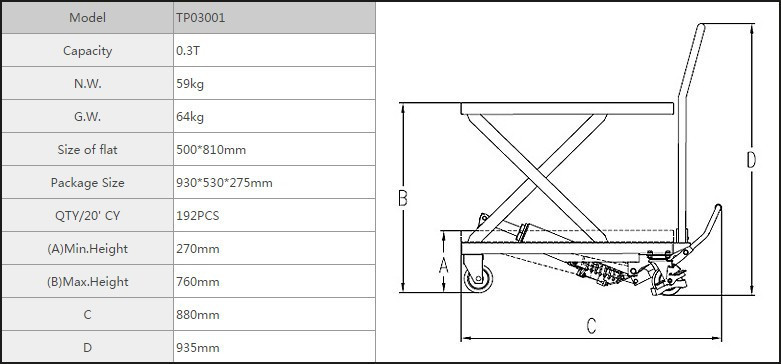 Dvojitý nůžkový mechanismus s hydraulickým válcem s rozsahem zdvihu 270 - 760 mm.