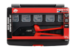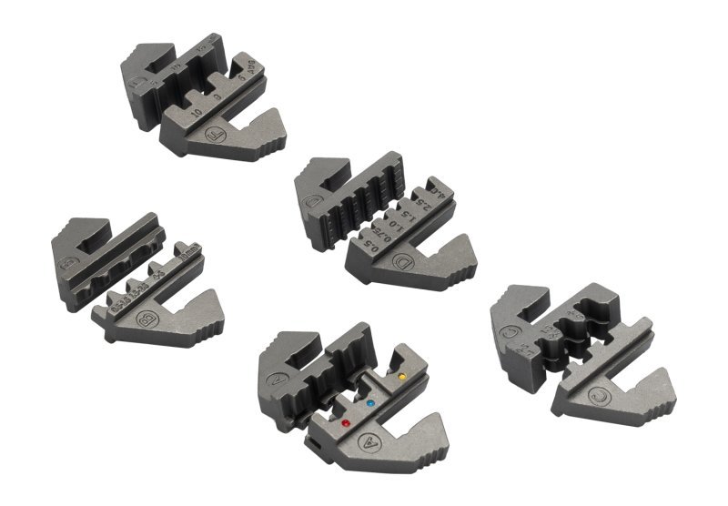 profesionální lisovací / krimpovací kleště s vyměnitelnými čelistmi na izolované a neizolované koncovky, dutinky na vodiče čelisti A - izolované koncovky DIN 0.5 - 1.0 / 1.5 - 2.5 / 4.0 - 6.0 mm2 - (AWG 22 - 18 / 16 - 14 / 12 - 10) čelisti B - neizolované koncovky DIN 0.5 - 1.0 / 1.5 - 2.5 / 4.0 - 6.0 / 10.0 mm2 - (AWG 22 - 18 / 16 - 14 / 12 - 10 / 8) čelisti C - neizolované koncovky DIN 0.5 - 1.0 / 1.5 - 2.5 / 4.0 - 6.0 mm2 - (AWG 22 - 18 / 16 - 14 / 12 /10) čelisti D - dutinky DIN 0.5 / 0.75 / 1.0 / 1.5 / 2.5 / 4.0 mm2 - (AWG 20 / 18 / 17 / 16 / 14 / 12) čelisti F - dutinky DIN 6.0 /10.0 / 16.0 mm2 - (AWG 10 / 8 / 6) snadná a rychlá výměna požadovaného typu čelistí ergonomické pohodlné rukojeti, převodový mechanismus - maximální přenos síly a dokonalé zalisování nebo krimpování koncovky nebo spojky samouvolňující ráčnový lisovací mechanismus praktický plastový uložný kufr s přehledným uspořádáním Instruktážní video