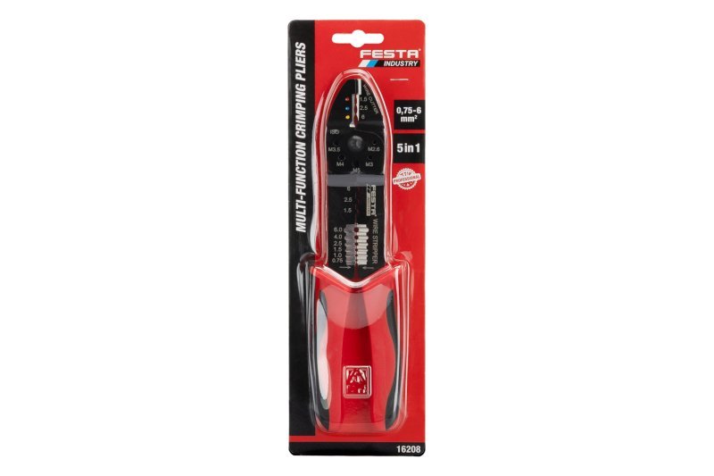 profesionální multifunkční kleště 5 v 1 se speciálními čelistmi pro střih, střih metrických šroubů, odizolovávání, lisování/krimpování izolovaných a neizolovaných koncovek měkčené rukojeti pro pohodlný úchop a stisk jedním nástrojem pokryjete široké spektrum prací při elektroinstalaci izolované koncovky 1.5, 2.5, 6.0 mm / neizolované koncovky 1.5, 2.5, 6.0 mm / střih metrickým šroubů M2.6, M3, M3.5, M4 a M5 / odizolovávání 0.75, 1.0, 1.5, 2.5, 4.0 a 6.0 mm + B16 : B19 Instruktážní video