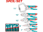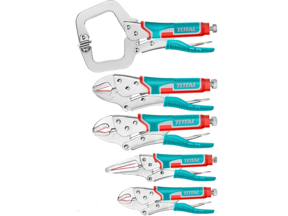 Sada rychloupínacích kleští je zabalena v rozkládacím obalu z PVC. Obal má 5 kapes, pro každé kleště jednu. Po zamotání obalu do ruličky je obal vybaven provázkem pro zavázání. Jednotlivé kleště jsou vybaveny sklolaminátovým krytím rukojetí, což usnadňuje úchop a práci s nůžkami. Sada obsahuje tyto typy kleští: 1 ks 180mm kleště se zahnutými čelistmi 1 ks 230mm kleště rychloupínací štípací s dl...