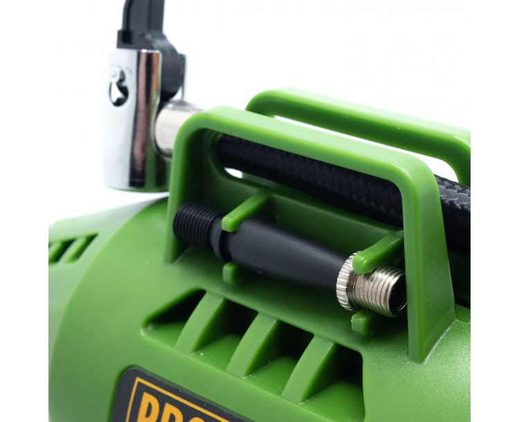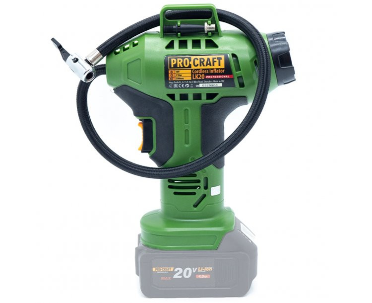 Aku kompresor Procraft LK20 (bez baterky a nabíječky). Displej, volba požadovaného tlaku, automatické vypnutí. Baterie: 20V, 2Ah. Max. plnící tlak: 160 psi, 11 atm, 1100 kPa. Otáčky: 0-3200/min. Průtok: 12l/min. Délka vzduchové hadice: 0,5m. Hmotnost: 1,4kg.