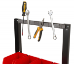 - Kovový rám organizéru na šroubky s 7 plastovými boxy na spojovací materiál a magnetickou lištou na nářadí pro dokonalou organizaci v dílně.