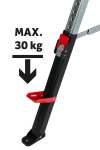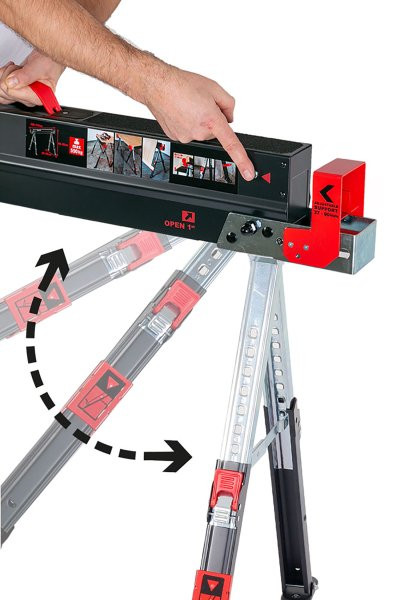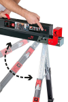 skládací a přenosná koza - podpěra s nosností 590 kg v páru 1180 kg intuitivní postup složení a rozložení, snadná manipulace a kompaktní rozměry po složení - pro přenos nebo převoz masivní celokovová konstrukce - výškově stavitelná v rozsahu 62 - 82 cm po obou stranách nastavitelné koncovky pro uchycení a fixaci dřevěných trámů nebo kovových profilů v rozmezí 4 - 9 cm nosná plocha s protikluznou vrstvou, na jedné straně noh výklopné opěrky pro OSB desky, lamino, apod. s nosností 30 kg na jednu opěrku Instruktážní video