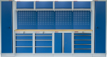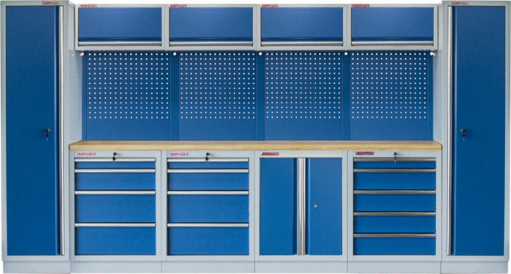 Sestava 21 ks, 3920 x 495 x 2000 mm, dřevěná pracovní deska, modulární, celokovová, modrá. Horní skříňky: 4 výklopné. Spodní skříňky: dvoukřídlá / 2x 4 a 5 šuplíková. Vysoké skříně: 2 úzké. 4 děrované desky s roztečí 38 x 38 mm. Kvalitní dílenský nábytek vhodný pro profesionální servisy i domácí garáže a dílny. Celý popis