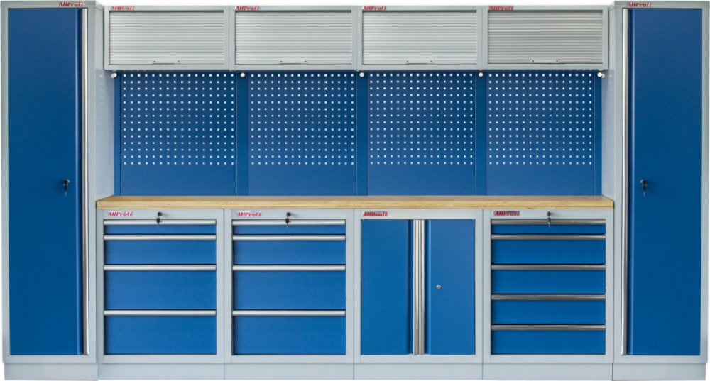 Sestava 21 ks, 3920 x 495 x 2000 mm, dřevěná pracovní deska, modulární, celokovová, modrá. Horní skříňky: 4 s roletou. Spodní skříňky: dvoukřídlá / 2x 4 a 5 šuplíková. Vysoké skříně: 2 úzké. 4 děrované desky s roztečí 38 x 38 mm. Kvalitní dílenský nábytek vhodný pro profesionální servisy i domácí garáže a dílny. Celý popis