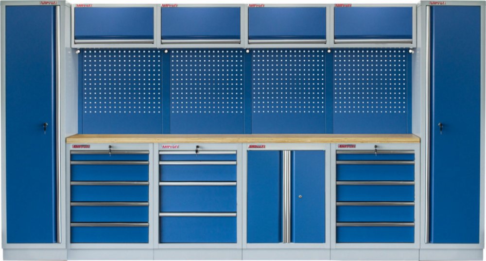 Sestava 21 ks, 3920 x 495 x 2000 mm, dřevěná pracovní deska, modulární, celokovová, modrá. Horní skříňky: 4 výklopné. Spodní skříňky: dvoukřídlá / 4 a 2x 5 šuplíková. Vysoké skříně: 2 úzké. 4 děrované desky s roztečí 38 x 38 mm. Kvalitní dílenský nábytek vhodný pro profesionální servisy i domácí garáže a dílny. Celý popis