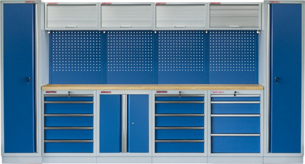 Sestava 21 ks, 3920 x 495 x 2000 mm, dřevěná pracovní deska, modulární, celokovová, modrá. Horní skříňky: 4 s roletou. Spodní skříňky: dvoukřídlá / 4 a 2x 5 šuplíková. Vysoké skříně: 2 úzké. 4 děrované desky s roztečí 38 x 38 mm. Kvalitní dílenský nábytek vhodný pro profesionální servisy i domácí garáže a dílny. Celý popis