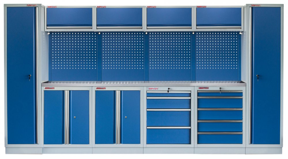 Sestava 21 ks, 3920 x 495 x 2000 mm, nerezová pracovní deska, modulární, celokovová, modrá. Horní skříňky: 4 výklopné. Spodní skříňky: 2x dvoukřídlá / 4 a 5 šuplíková. Vysoké skříně: 2 úzké. 4 děrované desky s roztečí 38 x 38 mm. Kvalitní dílenský nábytek vhodný pro profesionální servisy i domácí garáže a dílny. Celý popis
