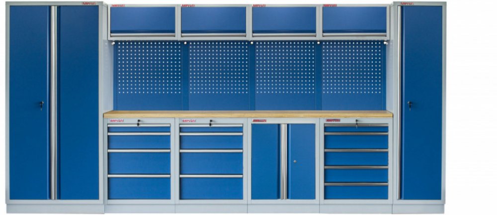 Sestava 21 ks, 4235 x 495 x 2000 mm, dřevěná pracovní deska, modulární, celokovová, modrá. Horní skříňky: 4 výklopné. Spodní skříňky: dvoukřídlá / 2x 4 a 5 šuplíková. Vysoké skříně: široká, úzká. 4 děrované desky s roztečí 38 x 38 mm. Kvalitní dílenský nábytek vhodný pro profesionální servisy i domácí garáže a dílny. Celý popis