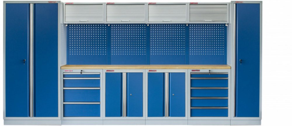 Sestava 21 ks, 4235 x 495 x 2000 mm, dřevěná pracovní deska, modulární, celokovová, modrá. Horní skříňky: 4 s roletou. Spodní skříňky: 2x dvoukřídlá / 4 a 5 šuplíková. Vysoké skříně: široká, úzká. 4 děrované desky s roztečí 38 x 38 mm. Kvalitní dílenský nábytek vhodný pro profesionální servisy i domácí garáže a dílny. Celý popis