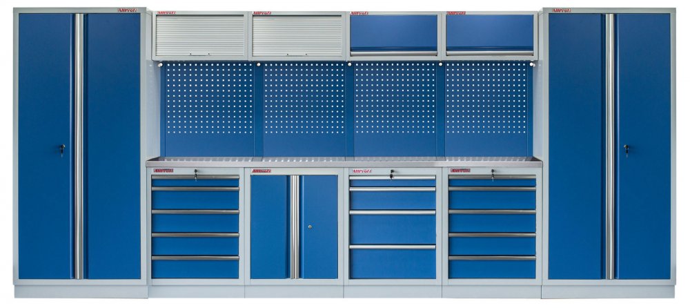 Sestava 21 ks, 4535 x 495 x 2000 mm, nerezová pracovní deska, modulární, celokovová, modrá. Horní skříňky: 2 výklopné, 2 s roletou. Spodní skříňky: dvoukřídlá / 4 a 2x 5 šuplíková. Vysoké skříně: 2 široké. 4 děrované desky s roztečí 38 x 38 mm. Kvalitní dílenský nábytek vhodný pro profesionální servisy i domácí garáže a dílny. Celý popis