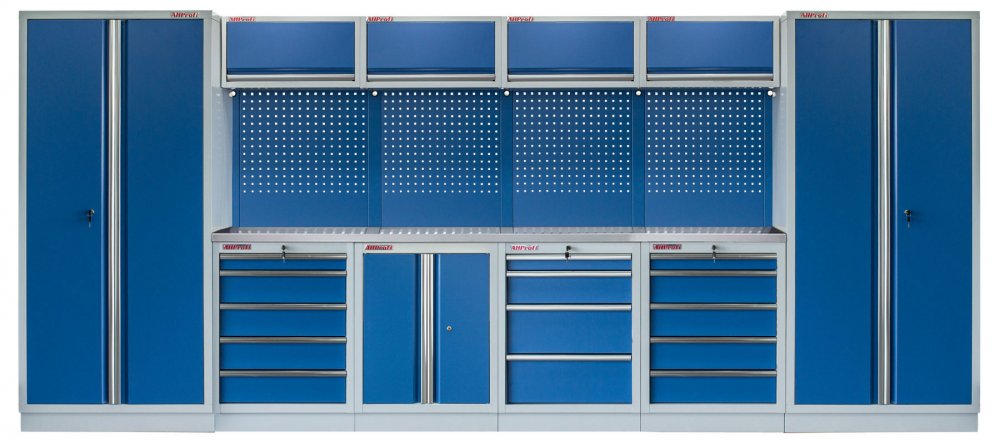 Sestava 21 ks, 4535 x 495 x 2000 mm, nerezová pracovní deska, modulární, celokovová, modrá. Horní skříňky: 4 výklopné. Spodní skříňky: dvoukřídlá / 4 a 2x 5 šuplíková. Vysoké skříně: 2 široké. 4 děrované desky s roztečí 38 x 38 mm. Kvalitní dílenský nábytek vhodný pro profesionální servisy i domácí garáže a dílny. Celý popis