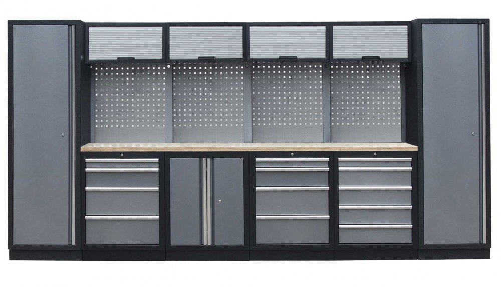 Sestava 21 ks, 3920 x 495 x 2000 mm, dřevěná pracovní deska, modulární, celokovová, šedá. Horní skříňky: 4 s roletou. Spodní skříňky: dvoukřídlá / 2x 4 a 5 šuplíková. Vysoké skříně: 2 úzké. 4 děrované desky s roztečí 38 x 38 mm. Kvalitní dílenský nábytek vhodný pro profesionální servisy i domácí garáže a dílny. Celý popis