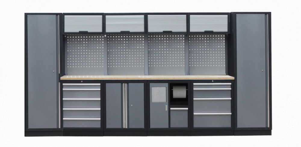 Sestava nábytku v sobě skrývá dostatečné množství úložného prostoru pro vaše nářadí, autotechniku i dílenské vybavení. V kombinaci s bytelnou pracovní deskou získáte multifunkční stěnu, se kterou vám půjde práce od ruky ve všech směrech.