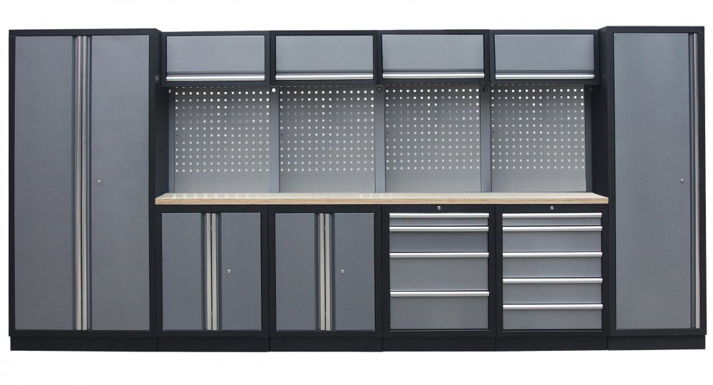 Sestava nábytku v sobě skrývá dostatečné množství úložného prostoru pro vaše nářadí, autotechniku i dílenské vybavení. V kombinaci s bytelnou pracovní deskou získáte multifunkční stěnu, se kterou vám půjde práce od ruky ve všech směrech.