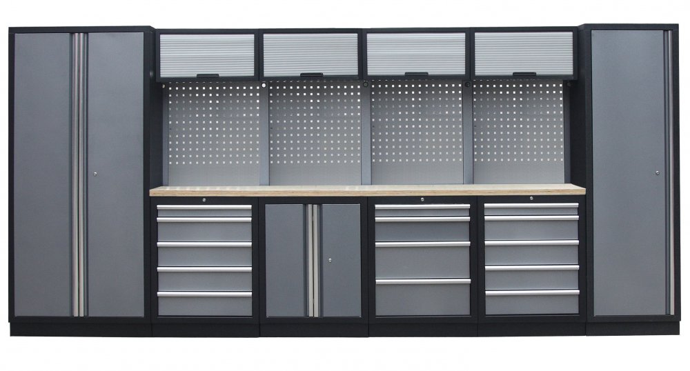 Sestava 21 ks, 4235 x 495 x 2000 mm, dřevěná pracovní deska, modulární, celokovová, šedá. Horní skříňky: 4 s roletou. Spodní skříňky: dvoukřídlá / 4 a 2x 5 šuplíková. Vysoké skříně: široká, úzká. 4 děrované desky s roztečí 38 x 38 mm. Kvalitní dílenský nábytek vhodný pro profesionální servisy i domácí garáže a dílny. Celý popis