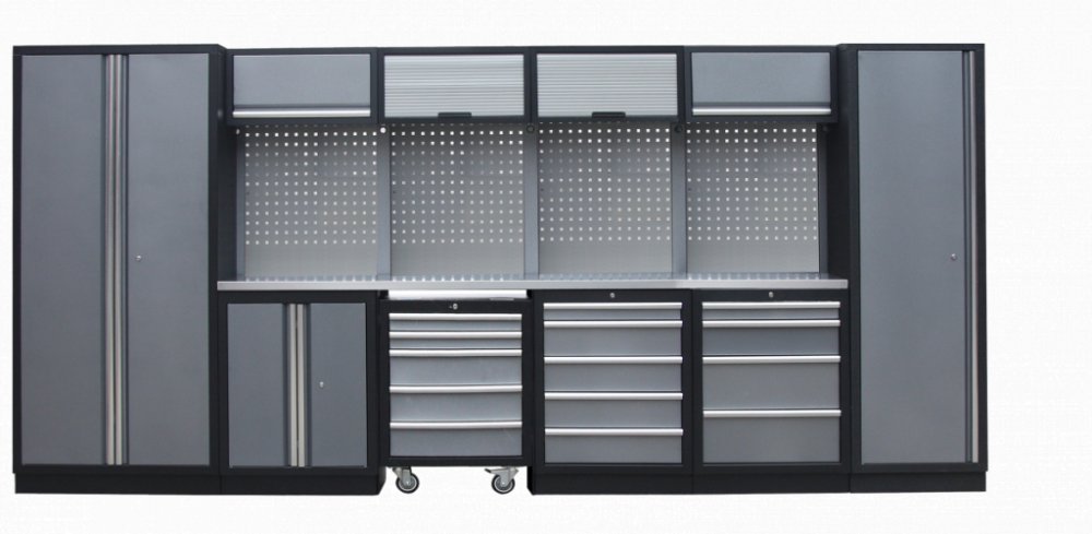 Sestava dílenského nábytku ve vysoké kvalitě, který je vhodný pro profesionální servisy i domácí garáže a dílny. Nábytek je celokovový s kovovou pracovní deskou. Sestava 21 ks dílenského nábytku udrží nářadí přehledně uklizené na správném místě.