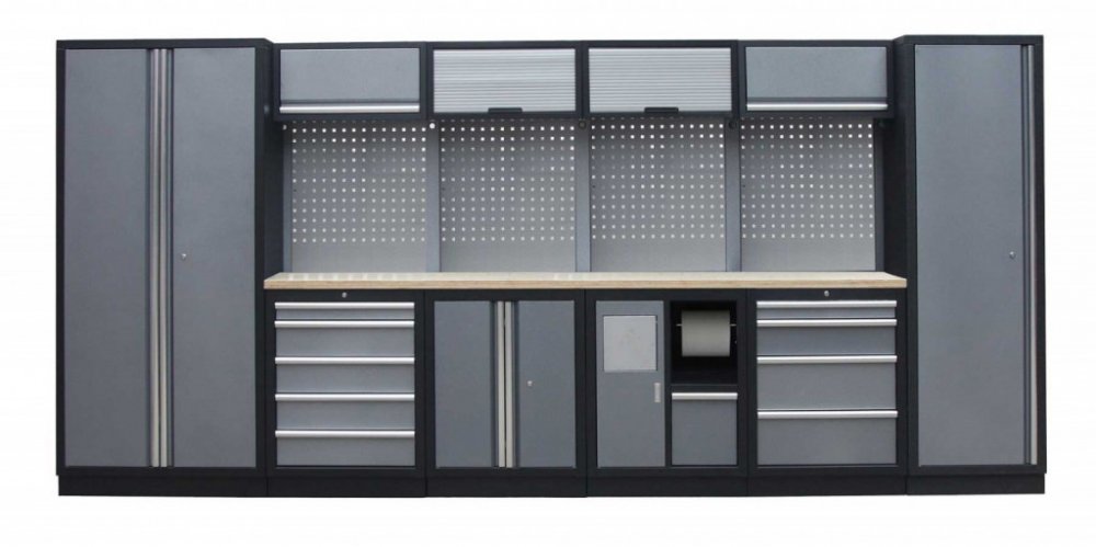 Sestava nábytku v sobě skrývá dostatečné množství úložného prostoru pro vaše nářadí, autotechniku i dílenské vybavení. V kombinaci s bytelnou pracovní deskou získáte multifunkční stěnu, se kterou vám půjde práce od ruky ve všech směrech.