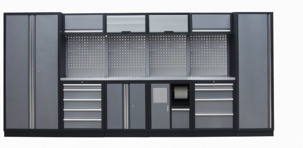 Sestava 21 ks, 4235 x 495 x 2000 mm, nerezová pracovní deska, modulární, celokovová, šedá. Horní skříňky: 2 výklopné, 2 s roletou. Spodní skříňky: dvoukřídlá / s košem / 4 a 5 šuplíková. Vysoké skříně: široká, úzká. 4 děrované desky s roztečí 38 x 38 mm. Kvalitní dílenský nábytek vhodný pro profesionální servisy i domácí garáže a dílny. Celý popis