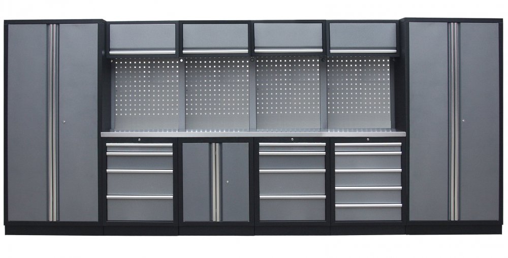 Sestava 21 ks, 4535 x 495 x 2000 mm, nerezová pracovní deska, modulární, celokovová, šedá. Horní skříňky: 4 výklopné. Spodní skříňky: dvoukřídlá / 2x 4 a 5 šuplíková. Vysoké skříně: 2 široké. 4 děrované desky s roztečí 38 x 38 mm. Kvalitní dílenský nábytek vhodný pro profesionální servisy i domácí garáže a dílny. Celý popis