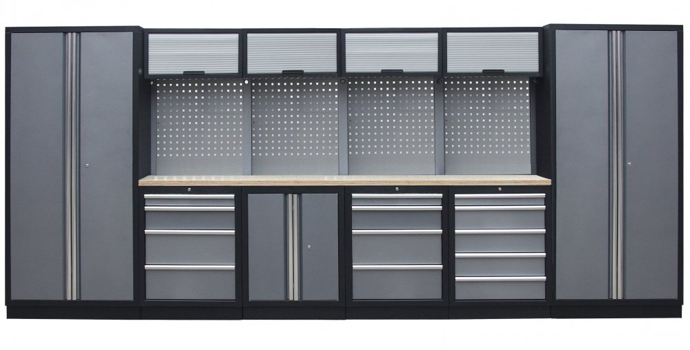 Sestava 21 ks, 4535 x 495 x 2000 mm, dřevěná pracovní deska, modulární, celokovová, šedá. Horní skříňky: 4 s roletou. Spodní skříňky: dvoukřídlá / 2x 4 a 5 šuplíková. Vysoké skříně: 2 široké. 4 děrované desky s roztečí 38 x 38 mm. Kvalitní dílenský nábytek vhodný pro profesionální servisy i domácí garáže a dílny. Celý popis