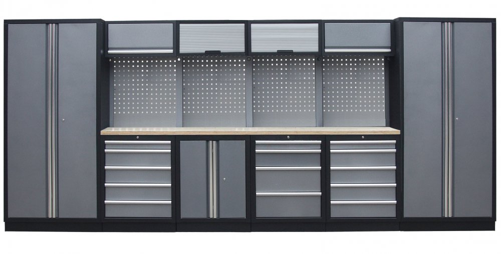 Sestava 21 ks, 4535 x 495 x 2000 mm, dřevěná pracovní deska, modulární, celokovová, šedá. Horní skříňky: 2 výklopné, 2 s roletou. Spodní skříňky: dvoukřídlá / 4 a 2x 5 šuplíková. Vysoké skříně: 2 široké. 4 děrované desky s roztečí 38 x 38 mm. Kvalitní dílenský nábytek vhodný pro profesionální servisy i domácí garáže a dílny. Celý popis